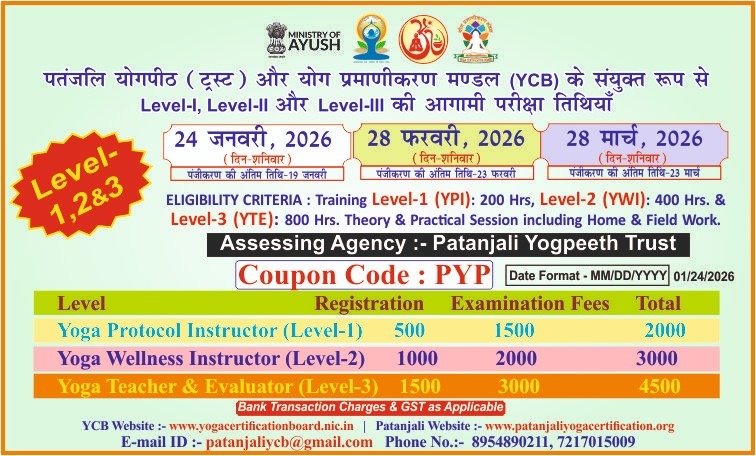 Yoga Certification Board is established for certification of Yoga professionals and accreditation Institutions, prescribing syllabus for various levels of Yoga trainers and any such activities that may be considered necessary for promotion of Yoga. Professional assessment of these service providers are carried so as to certify the competencies so that user of the the service is assured of the skill sets possessed by the trainer.